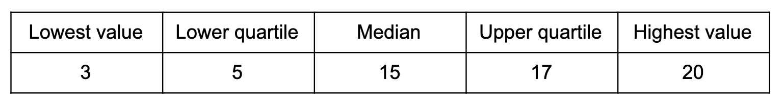 Cuando te pidan que dibujes un diagrama de caja, es posible que te presenten los datos en una tabla o que te indiquen cada una de las características anteriores; veamos ambos ejemplos y cómo los trazarías.