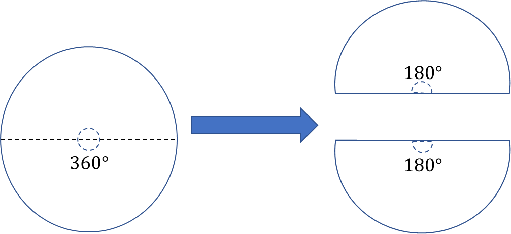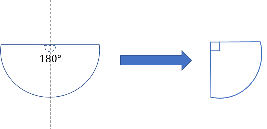 Observa que el ángulo subtendido por el semicírculo es de 180 grados, que es la mitad del ángulo subtendido en el centro de todo el círculo. Dividiendo 180 grados entre 360 grados, obtenemos que lo que multiplica el área del círculo. Dicho de otro modo,