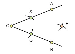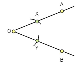 Paso 1: Dadas dos rectas OA y OB, toma O como centro y traza dos arcos tales que corten a OA y OB en los puntos X e Y respectivamente. La luz del compás debe ser menor que la distancia de OA y OB. Aquí, OX = OY.