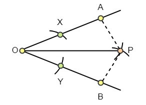Paso 3: Une los puntos OP. La recta OP es la bisectriz del ángulo O. Aquí, AP = BP y el ángulo O se divide en dos medidas iguales: Ángulo AOP y Ángulo BOP.