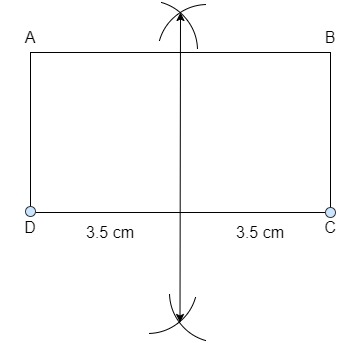 Se nos dice que cortemos el lado CD en dos mitades iguales. Esto sugiere que necesitamos hallar la mediatriz de la recta CD. Siguiendo los pasos anteriores, encontramos que la mediatriz de CD divide este lado (que mide 7 cm) en dos longitudes iguales de medidas 3,5 cm cada una.
