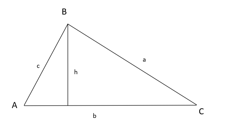 Empecemos con un triángulo como el anterior, pero tracemos una línea hacia abajo desde el ángulo superior, de modo que ahora tengamos dos triángulos rectángulos, y llamemos a esta línea h, como se muestra a continuación.