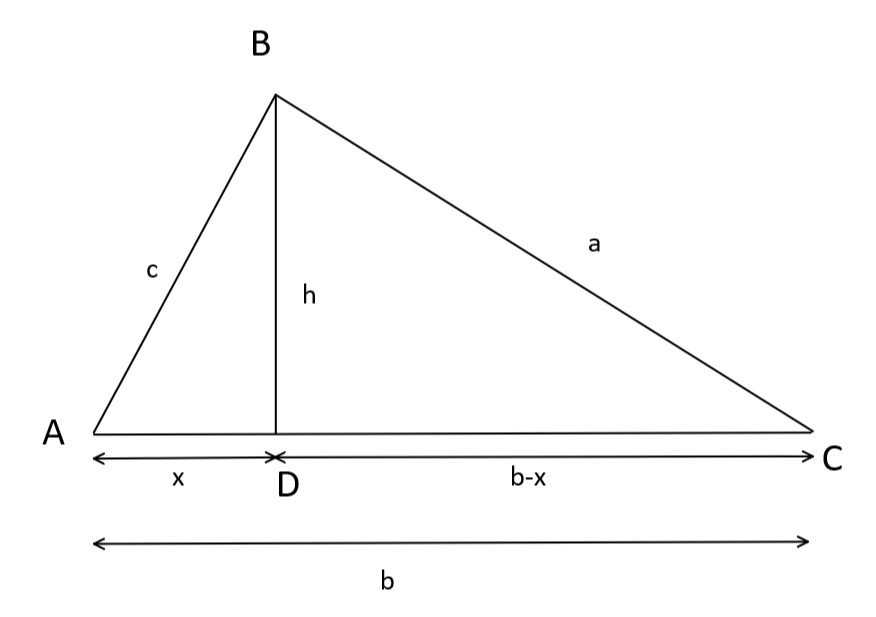 x² = c²-h²......... (1) Haciendo lo mismo con el triángulo rectángulo, obtenemos y lo expandiremos a b²-2bx + x² + h² = a²....... ... (2) Si tomamos el coseno del ángulo A, obtenemos cos (A) = x / c, que se reordena a