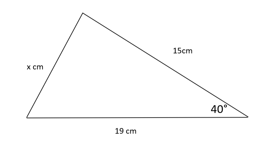 R: Utilizando la regla del coseno, obtenemos que x² = 15² + 19² -2 - 15 - 19 - cos (40) = 149,354667 ..., lo que da x = √149,354667 ... = 12,2 (3.sf)